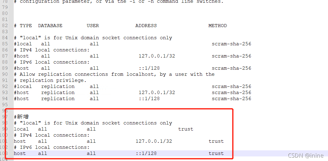 打开pg_hba.conf文件注释掉原来的配置,新增如下配置: