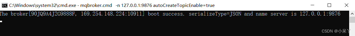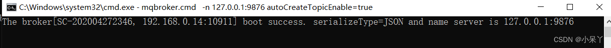 127.0.0.1:9876 autoCreateTopicEnable=true’,启动 Broker。成功后会弹出提示框,此框勿