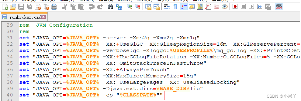 打开‘MQ 文件夹\bin’下的 runbroker.cmd,然后将‘%CLASSPATH%’加上英文双引号。保存