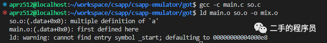main.c 与 sub.c 里面都定义了一个a变量,a都是全局符号,且初始化过,所以他们都是强符号。编译 main.c 与 sub.c 时是没有问题的,但是链接就会报错: