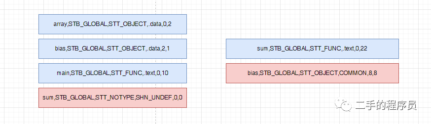 无论是从源码,还是符号表中,都可以看到 main.c 里面使用了 sum.c 中定义的 sum 符号,sum.c 里面使用了 main.c 里面定义的 bias 符号。