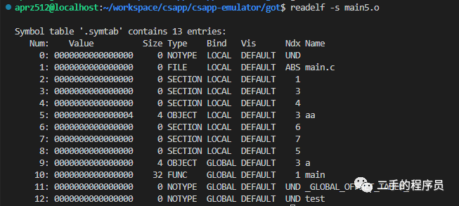 我们可以使用 readelf -s 命令来查看符号表里面的内容,确定一下(main5.o 是经过编译器编译后的 .o 文件):