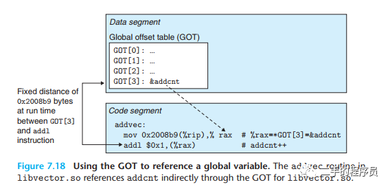 在代码段里面,对于全局变量 addcnt 的引用会被编译器替换为 GOT[3] 的地址,而 GOT[3] 的地址里面储存的就是 addcnt 变量的真实地址。由于 .text 与 .data 的距离固定,所以这里比较好计算出偏移,这个偏移(0x2008b9)就是位置无关代码。