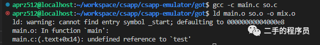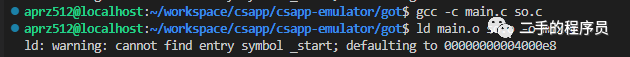 由于要生成可执行文件,还需要很多东西(比如调用 main 的 _start 函数)。这里只是简单链接,所以报了一个警告,忽略他。