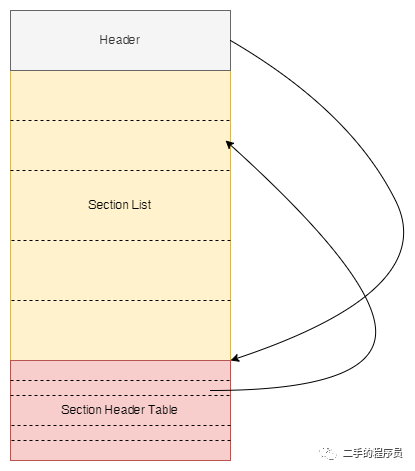 这个格式框架非常的简单,Header 是 elf 文件的文件头,文件头里面描述了 Section Header Table 的位置,我们找到 Section Header Table,里面是一个一个的 Entry,每个 Entry 里面描述了对应的 Section 的一些信息,我们就又可以找到 Section 的内容。