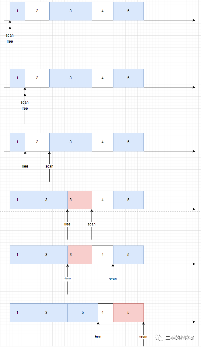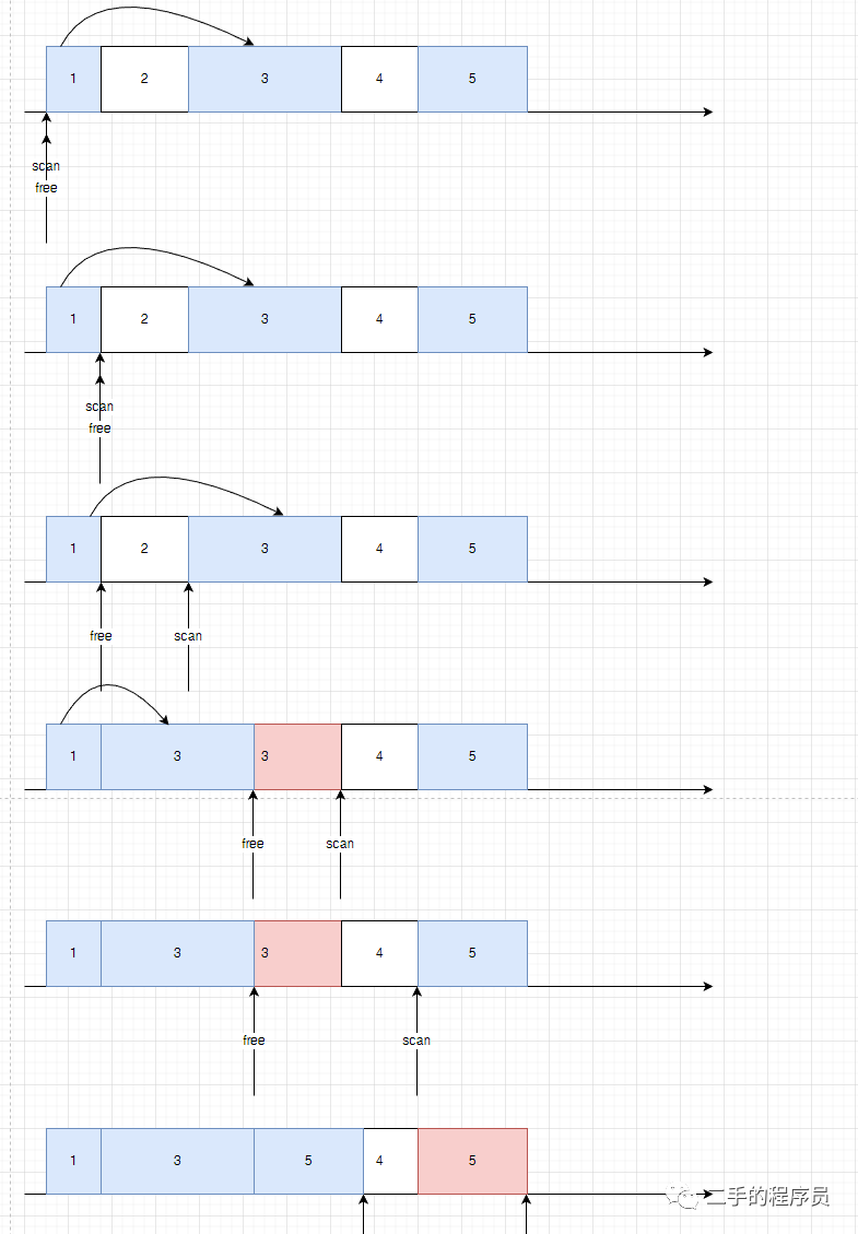 算法很简单,就是使用2个指针,一个指针 free 指向空闲位置,一个指针 scan 指向存活的对象。有点类似 leetcode 里面的一个题目,就是在一次遍历中去除数组中的重复元素。