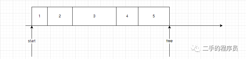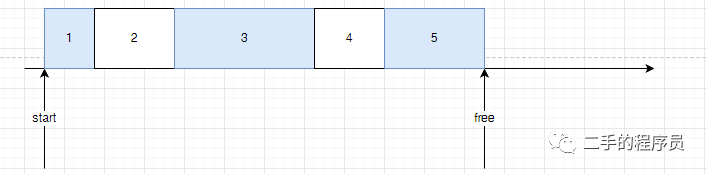 mark 过程结束之后,每个可达对象就已经被标记了,其他的都是垃圾。举个例子,假设我们分配了 5个 heap block,如下: