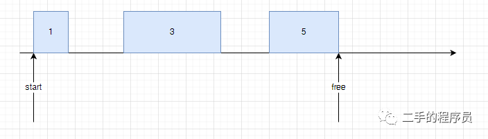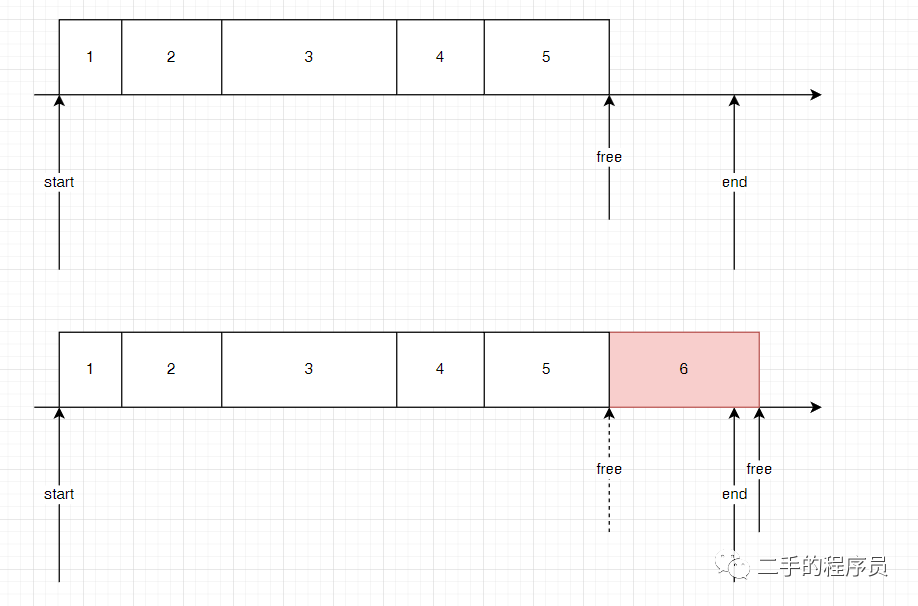 当第 6 个对象要分配的时候,发现 free + size(6) > end,这个时候就要进行 gc。