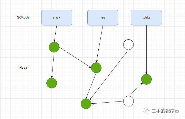 有一些指针是赋值器可以直接访问的,我们称之为 GCRoots。GCRoot 指向堆区的对象,借助GCRoots 我们可以访问整个堆区分配的对象。
