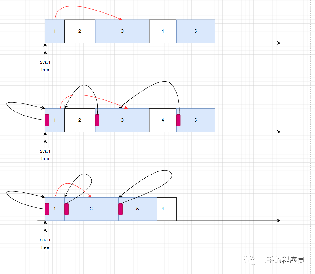 此时,scan 与 free 指针指向 block 2,它是没有被 mark,说明这块地方可以放东西,那么我们只将 scan 指针移动 sizeof(block) 的大小。