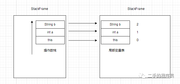 参数的传递过程,其实就是将调用者栈帧的操作数栈中 pop 出数据,放入到被调用者栈帧的局部变量表中: