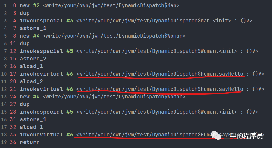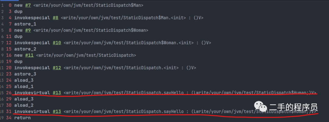 静态类型同样都是Human的两个变量man和woman在调用sayHello()方法时产生了不同的行为。这是如何做到的呢?我们需要从 invokevirtual 指令入手: