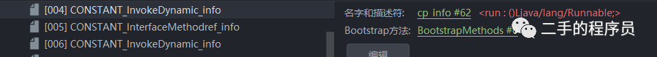 它的结构体里面储存了2个信息,第一个是 lambda 表达式实现的接口方法名和类型。第二个是一个 BootstrapMethods 的索引。
