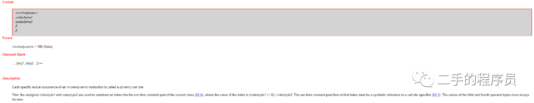 在第8个字节的位置,出现了一个 invokedynamic 指令。我们看一下官方文档: