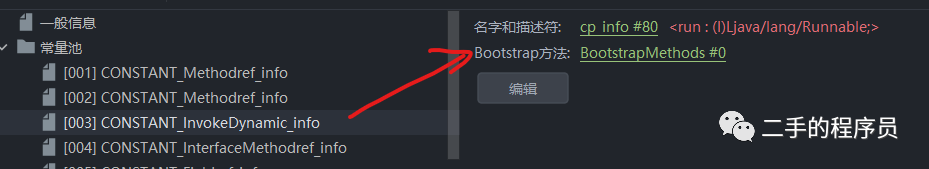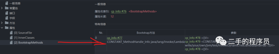 常量池索引指向的是一个 CONSTANT_InvokeDynamic_info 类型的常量。而这个常量里面又指向了 BootstrapMethods的索引: