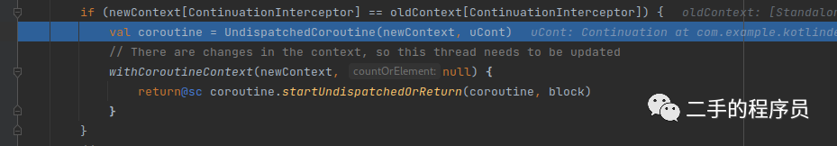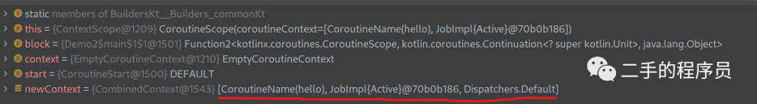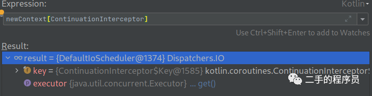 可以看到,它会判断如果旧的 context 里面有Dispatchers(也叫 ContinuationInterceptor),那么就不添加,如果没有,那么就添加一个 Dispatchers.Default。