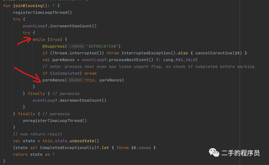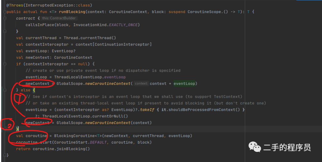 里面的代码比较多,但是我们只需要关注两个位置,第一个是 CoroutineContext ,第二个是 BlockingCoroutine。这两个东西我们后面文章会说到,现在只需要了解这个函数的作用即可,可以扩展一下,为啥这个函数能阻塞当前线程呢?
