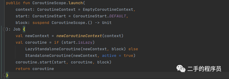 我们传递的 context 里面没有 job 的话,这个会默认给我们加一个 job,这一点很重要,因为 job 也是有派系的,会影响到协程里面异常与取消的行为,后面再说。