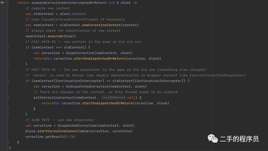 首先,这个货是一个挂起函数,它只能在协程(宿主)里面调用,协程宿主本身也是有一个 context 的,这个函数也要求传递一个 context,所以会涉及到 context 合并的问题。