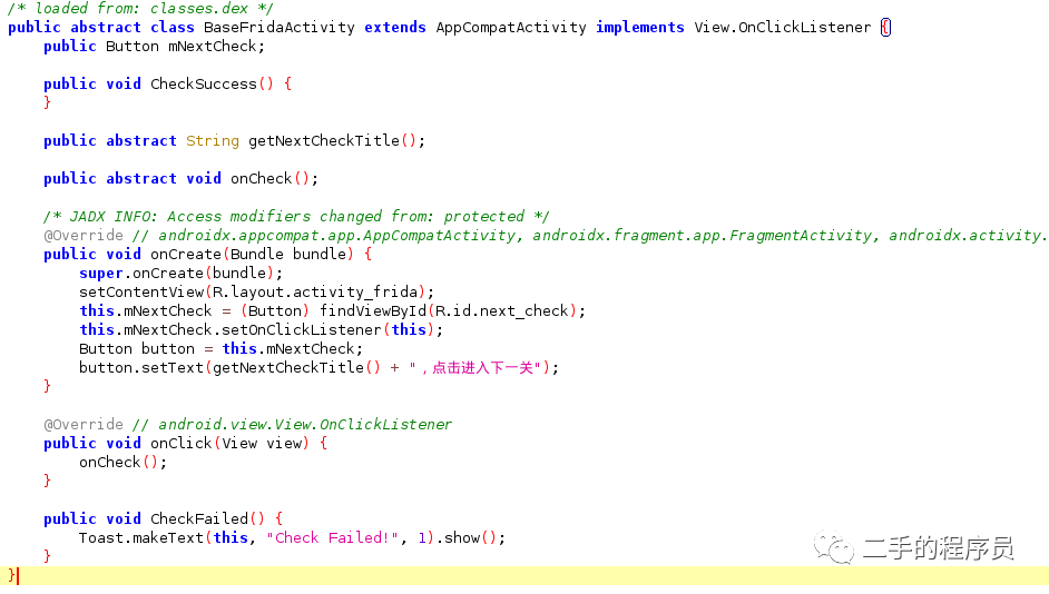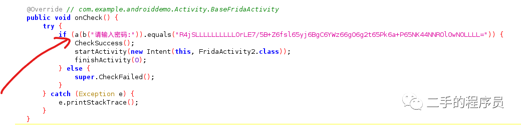 核心逻辑在 FridaActivity1 的 onCheck 方法里面,我们得让 a(b("请输入密码:")) 这个玩意的结果返回后面那一长串字符即可。