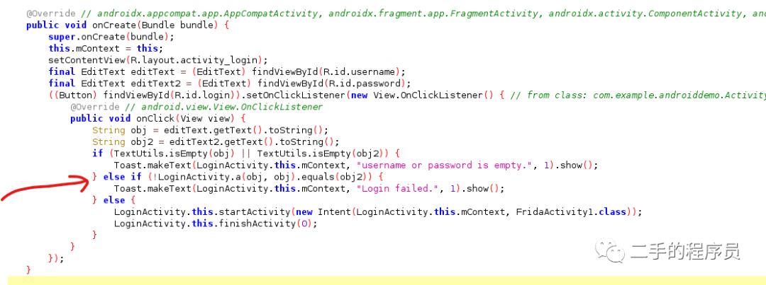 LoginActivity.a 方法返回了一个字符串,obj2 是第二个输入框的字符串。