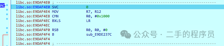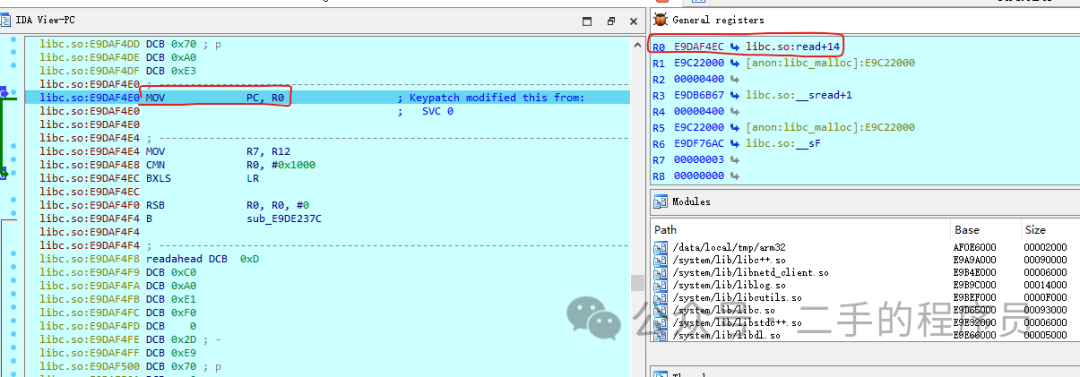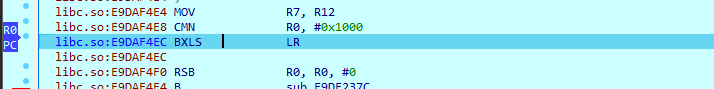 我们 patch 程序,将断点位置的指令改为 mov pc, r0 ,在这之前给 r0 赋值 0xE9DAF4EC,也就是往下数3条指令的位置: