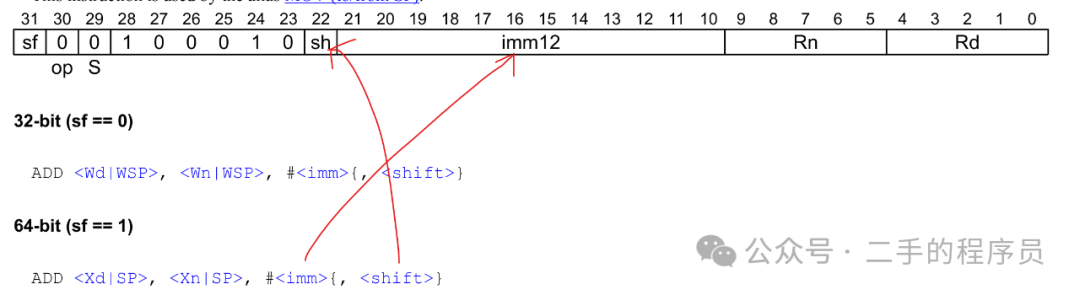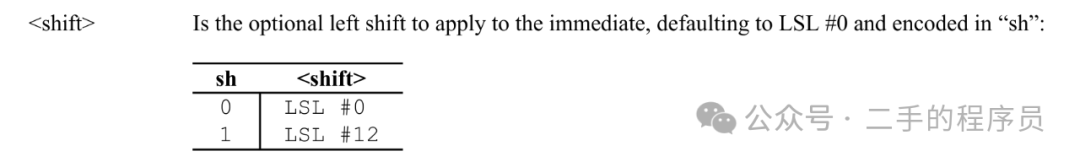 shift 是对 imm 进行移位,shift 为 0 的时候,表示左移 0 位,即不变。shift 为 1 的时候,表示左移12 位: