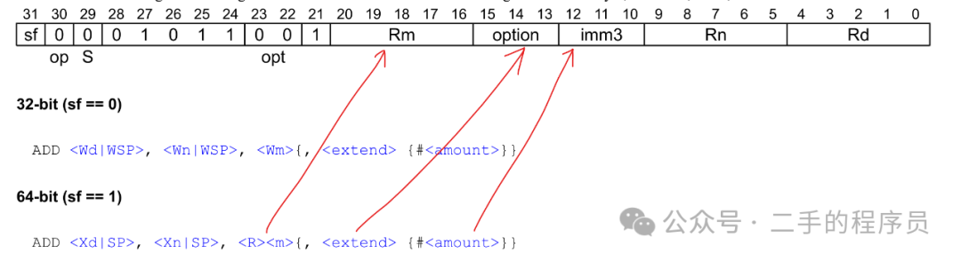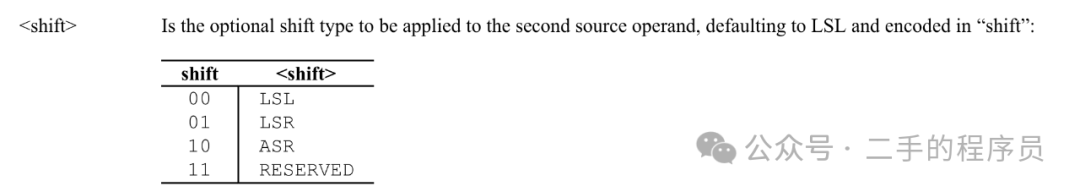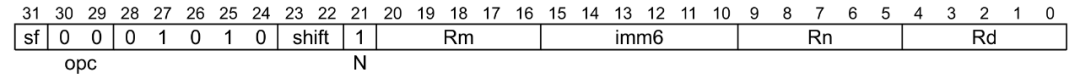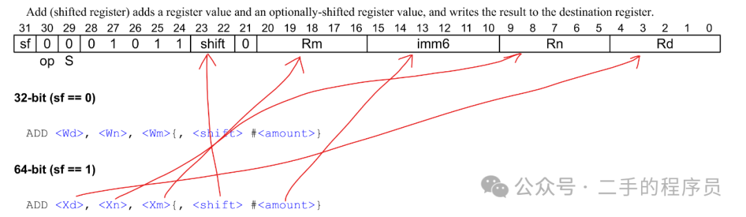 这个指令表示在相加前,需要将 X2 的值逻辑左移63 位。 imm6 是 6 位,刚刚好表示 0 ~ 63 的移位。