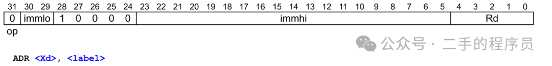 adr指令根据PC的偏移地址计算目标地址。偏移地址是一个21位(immhi:immlo)的有符号数,加上当前的PC地址得到目标地址。adr可以获取当前PC地址±1MB范围内的地址。