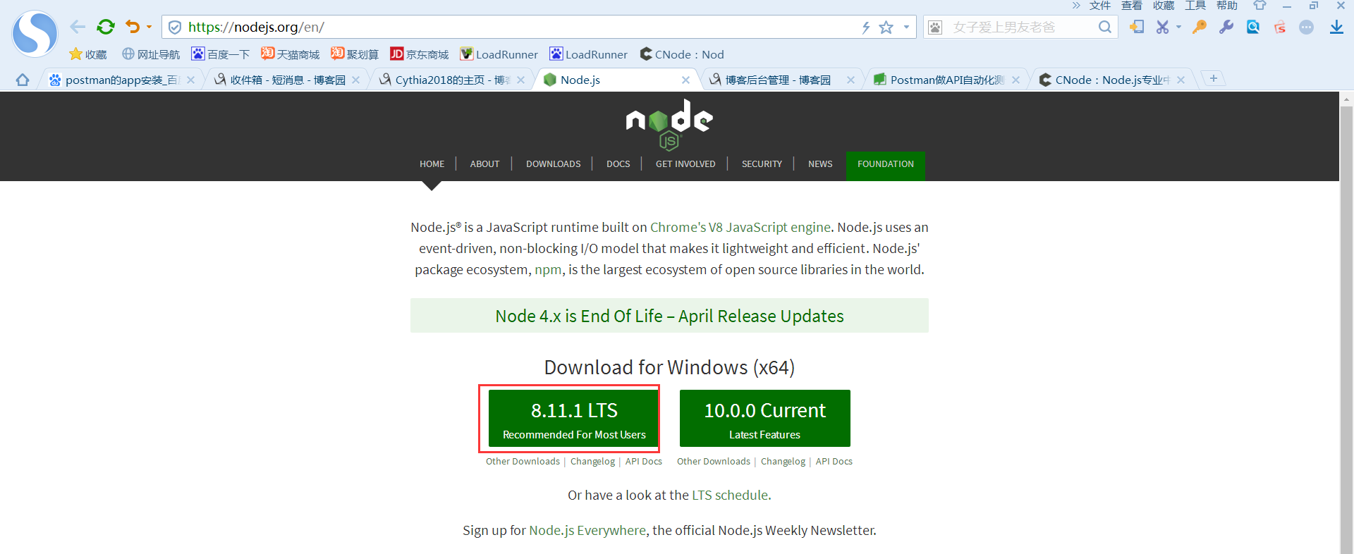 1. 先安装node.js , 下载地址:https://nodejs.org/en/ ,双击后根据提示下一步安装完成
