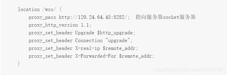 接着是location字段,后面会接一个小字段,这个就是当客户访问指定端口时使用的协议标识,wss就是/wss,http直接是/,根据标识的不同,定位到的代码段就不同,比如当识别为http标识时就会到下面的location代码段当中,代码块中有相关的处理根目录,默认文档日志等等设置,需要注意的是proxy_pass参数,这个填的是http://$upstram$/,其中upstream需要事先定义例如:
