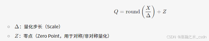 - 将权重(Weights)和激活值(Activations)从连续浮点空间映射到离散整数空间,公式: