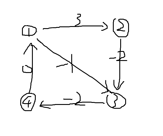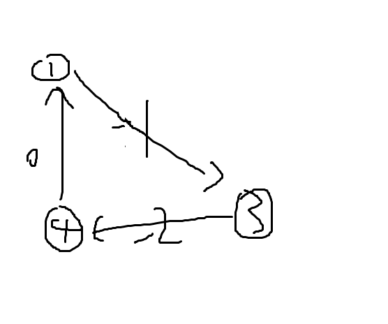 由于最小边权要大于0,且为整数,所以至少唯一。如果1都达不到,就无解了。但是怎么判断这个查分约束系统无解?可以画一个图,例如: