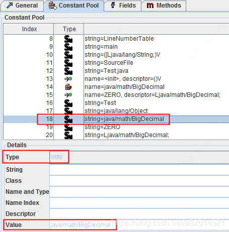使用Java Class File Editor工具打开上述编译生成的Test.class文件,查看“Constant Pool”页,可以看到类型为“Utf8”的常量,值为“java/math/BigDecimal”,与class文件结构说明相符。