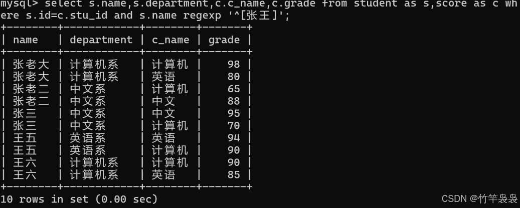 where s.id=c.stu_id and s.name regexp '^[张王]';
