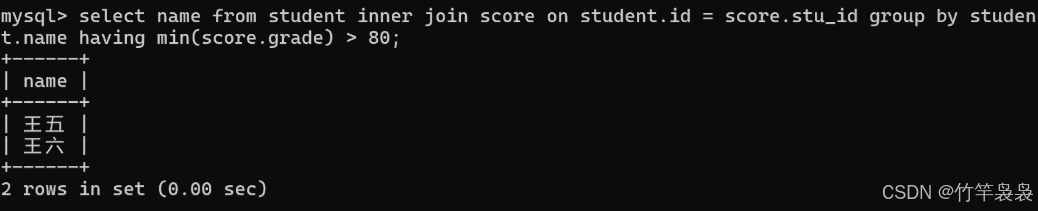 19.查询出每门课程都大于80分的学生姓名,类似于这个题目:查询所有成绩都及格的学生