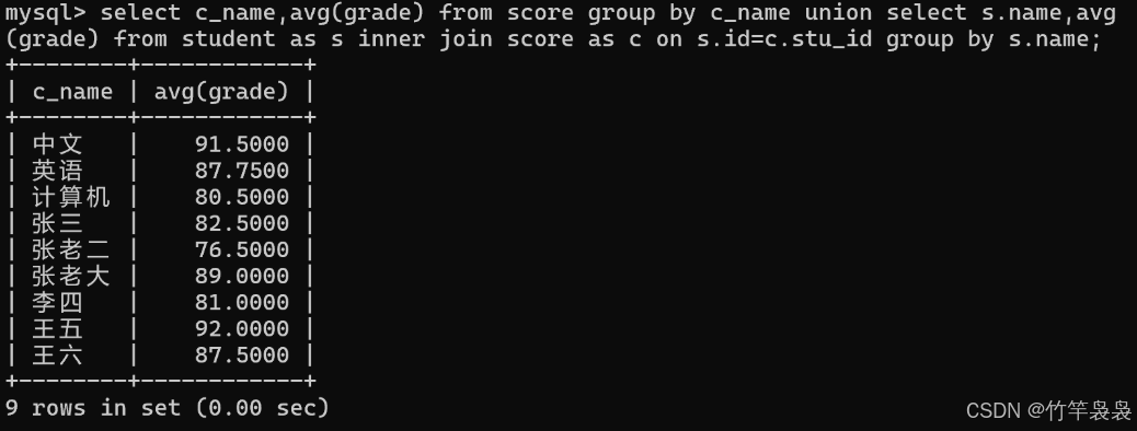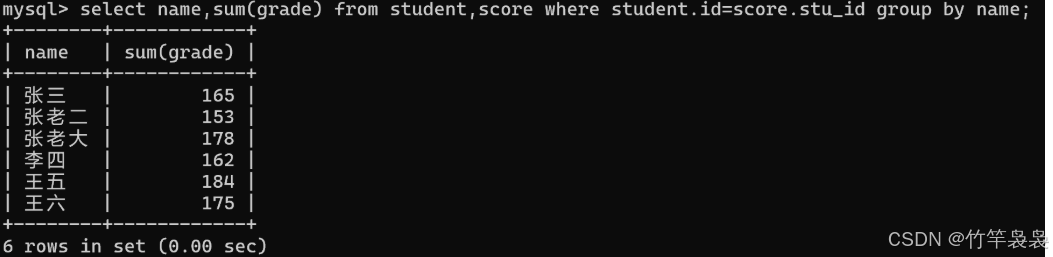 student as s inner join score as c on s.id=c.stu_id group by s.name;