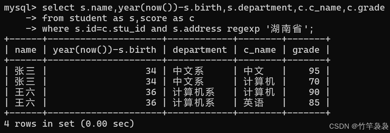where s.id=c.stu_id and s.address regexp '湖南省';