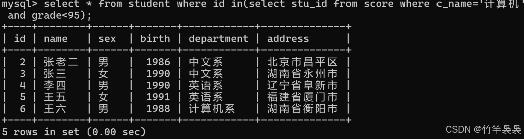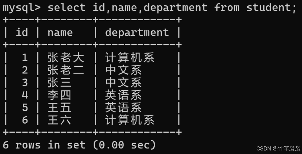 5.从student表查询所有学生的学号(id)、姓名(name)和院系(department)的信息