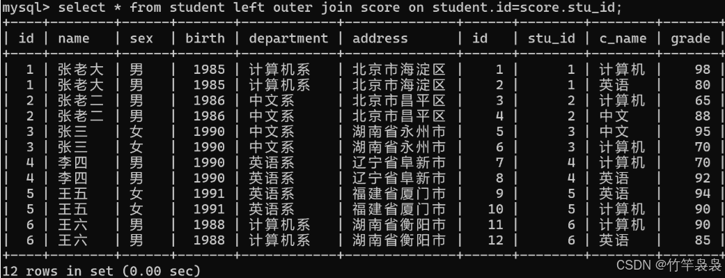 insert into `student`(`id`,`name`,`sex`,`birth`,`department`,`address`) values (1,'张老大','男',1985,'计算机系','北京市海淀区');