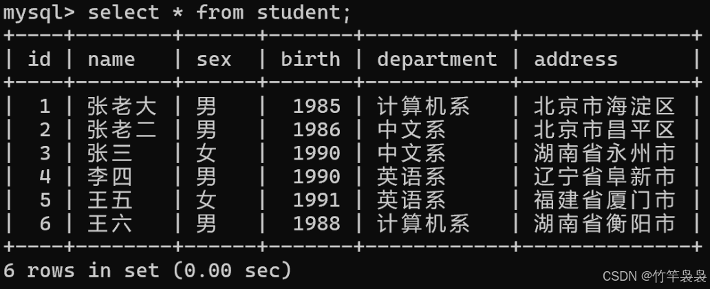 insert into `student`(`id`,`name`,`sex`,`birth`,`department`,`address`) values (6,'王六','男',1988,'计算机系','湖南省衡阳市');