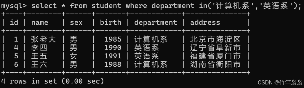 insert into `student`(`id`,`name`,`sex`,`birth`,`department`,`address`) values (4,'李四','男',1990,'英语系','辽宁省阜新市');