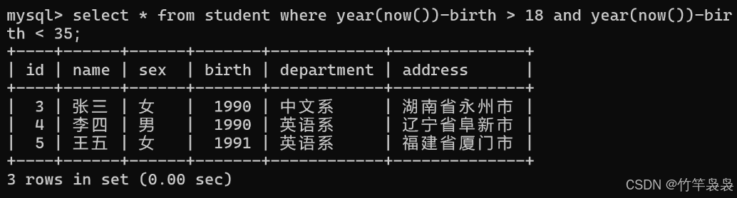 insert into `student`(`id`,`name`,`sex`,`birth`,`department`,`address`) values (3,'张三','女',1990,'中文系','湖南省永州市');