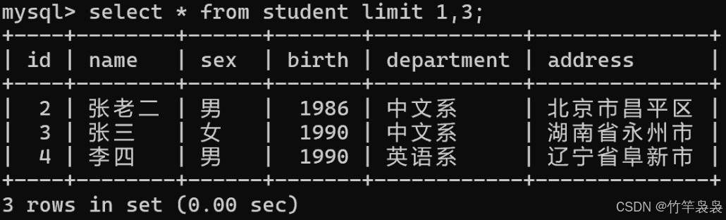 insert into `student`(`id`,`name`,`sex`,`birth`,`department`,`address`) values (2,'张老二','男',1986,'中文系','北京市昌平区');