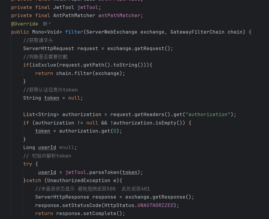 9.很多微服务需要用户校验 多个微服务本身校验即存在代码冗余 又不安全 因此选择在网关校验 把校验用户信息放请求头(防止对业务请求体造成影响)整体是一个责任链结构