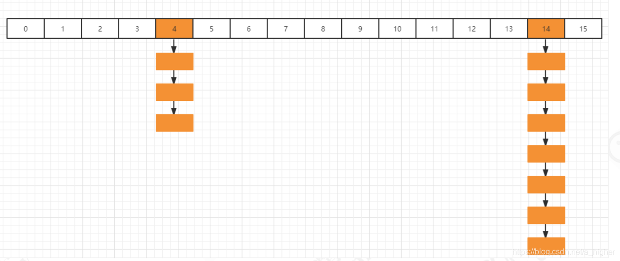 我们把 14 槽位的链表单独伶出来,我们用蓝色表示 fn&n=0 的节点,假如链表的分类是这 样