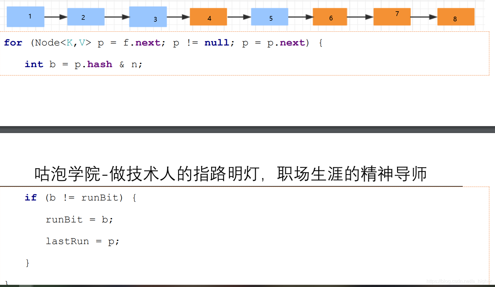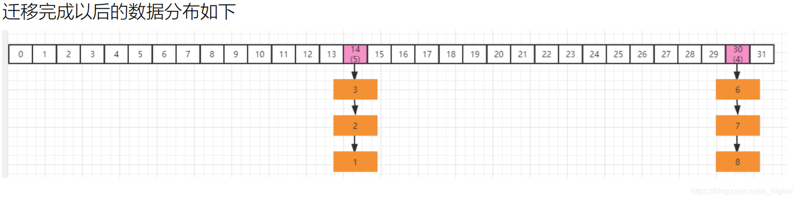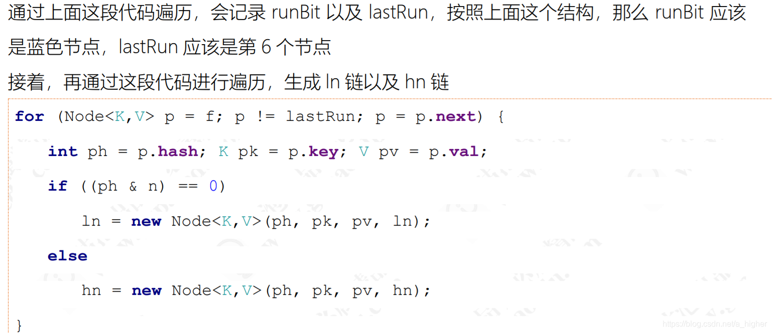 通过 fn&n 可以把这个链表中的元素分为两类,A 类是 hash 值的第 X 位为 0,B 类是 hash 值 的第 x 位为不等于 0(至于为什么要这么区分,稍后分析),并且通过 lastRun 记录最后要处 理的节点。最终要达到的目的是,A 类的链表保持位置不动,B 类的链表为 14+16(扩容增加 的长度)=30