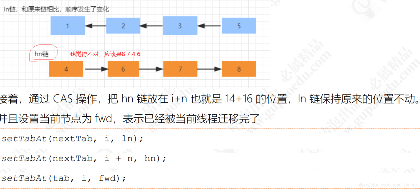 第 14 个槽位插入新节点之后,链表元素个数已经达到了 8,且数组长度为 16,优先通过扩容 来缓解链表过长的问题,扩容这块的图解稍后再分析,先分析高低位扩容的原理 假如当前线程正在处理槽位为 14 的节点,它是一个链表结构,在代码中,首先定义两个变量 节点 ln 和 hn,实际就是 lowNode 和 HighNode,分别保存 hash 值的第 x 位为 0 和不等于 0 的节点