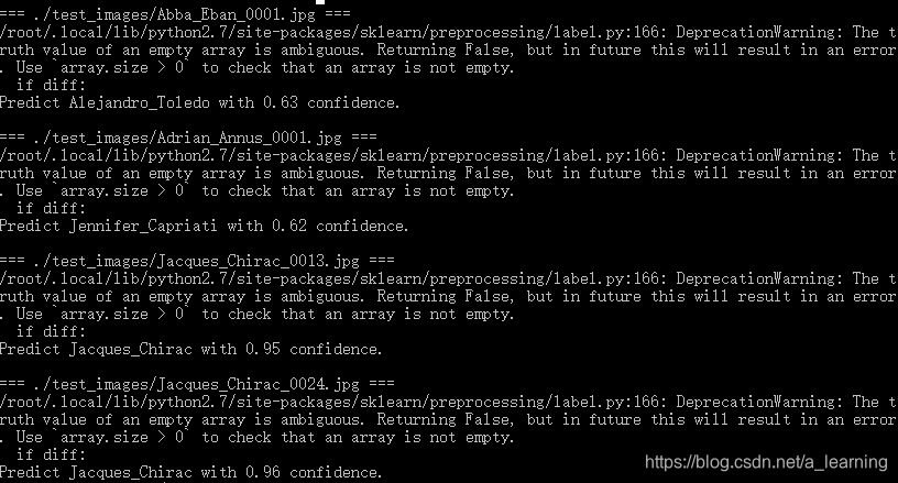 至此,remote_directory下有四个文件夹:aligned-images generated-embeddings test_images training_images - 测试 /root/openface/demos/classifier.py infer ./generated-embeddings/classifier.pkl ./test_images/* 结果如下: