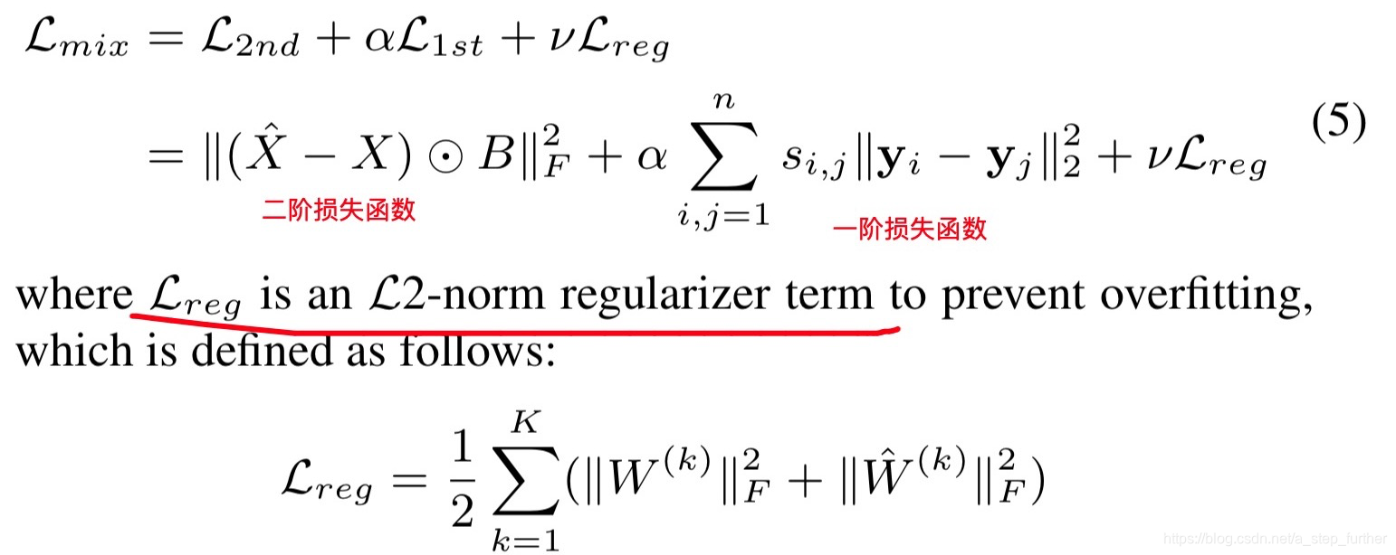 先回忆一下LINE,它是分别通过最优化求解一阶、二阶相似度的损失函数,得到了两个向量表示,然后简单地把两个向量拼接到了一起作为节点最终的向量表示。SDNE在这一步上有所改进,它定义一个损失函数如下所示: